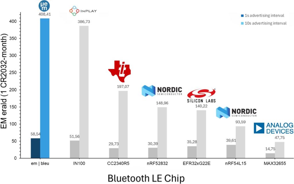 EM Microelectronic’s em | bleu Bluetooth® Low Energy chip has emerged as the clear leader in the BlueJoule benchmark with a score of 408 EM•eralds 10-second advertising period test, representing typical always-on sensor applications. In the more demanding 1-second advertising period scenario, typical of real-time asset tracking applications requiring frequent location updates, the em | bleu achieved also the best result with 58.5 EM•eralds. Developed by the EM Foundation, one EM•erald point equates to approximately one month of operation from a CR2032 coin cell battery.
